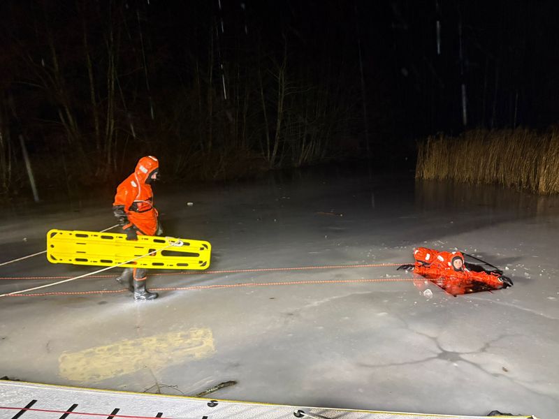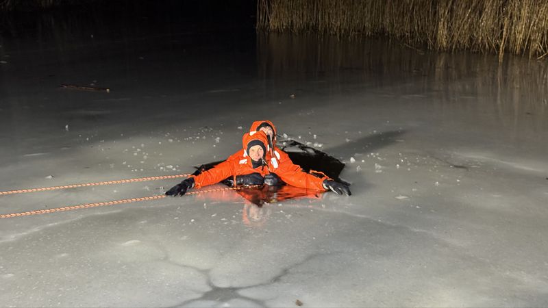 Zum Zeitpunkt der Übung war das Eis sehr dick und wies eine hohe Tragfähigkeit auf. Um eine realistische Rettungssituation darstellen zu können, sägten wir ein Loch ins Eis, durch das die Eisrettung simuliert wurde. Sowohl die zu rettende Person als auch die beiden Retter trugen Überlebensanzüge. Diese schützen im eiskalten Wasser vor dem Auskühlen, bieten ausreichend Auftrieb und verhindern ein Untergehen. Dank der auffälligen orangenen Farbe sowie integrierter Signalleuchten sind die Anzugträger auch aus größerer Entfernung gut erkennbar.