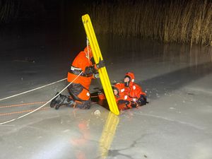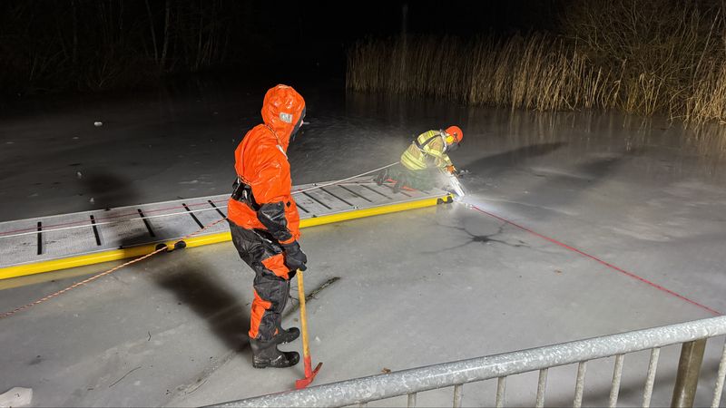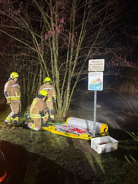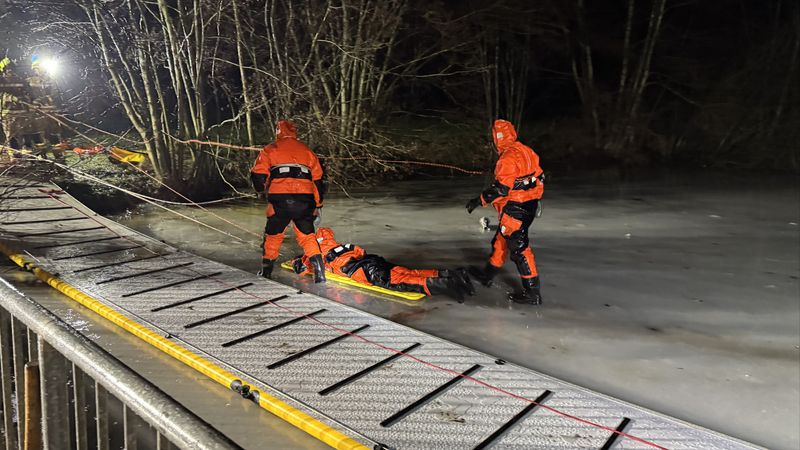 Der verunfallte Kamerad begab sich im Überlebensanzug auf das Eis und stieg in das zuvor geschaffene Eisloch. Anschließend lief der erste Retter über den Rettungssteg zur Unfallstelle und begab sich ebenfalls ins Wasser, um die verunfallte Person über Wasser zu halten. Im Eiswasser verlieren Betroffene durch Kälte, Nässe und Panik sehr schnell an Kraft.