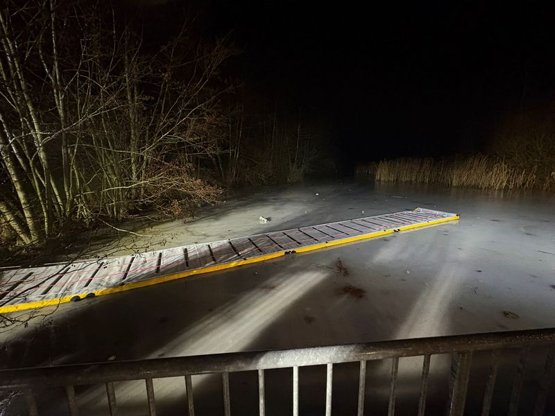 Aufgrund der niedrigen Außentemperaturen bauten wir das Schnelleinsatzzelt auf, das als Umkleide- und Aufwärmöglichkeit diente. Parallel dazu wurde der Wasserrettungssteg auf dem Eis ausgerollt und aufgeblasen. Dieser sorgt für eine gleichmäßige Lastverteilung, gleicht mögliche Schwachstellen im Eis aus und bietet den Rettern zusätzlichen Rutschschutz.
