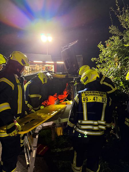 Die Feuerwehr Bünsdorf fuhr mit ihren Fahrzeugen einige Minuten vor uns die Übungseinsatzstelle an, da sie im Realfall bei einem Verkehrsunfall im Einsatzgebiet Bünsdorf ebenfalls einige, entscheidene Minuten vor uns eintreffen. Sie führten erste Stabilisierungsmaßnahmen durch und schafften eine Erstöffnung, um einen Zugang zur verletzten Übungspuppe zu bekommen.