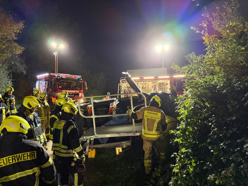 Wir entnahmen anschließend alle Scheiben und entfernten das Dach des Fahrzeugs, um die verletzte Übungspuppe ohne viel Bewegung aus dem Fahrzeug zu retten. Jedoch bemerkten wir schnell, dass die Übungspuppe auch im Fußraum eingeklemmt war. Mit unseren hydraulischen Stempeln kippten wir den Vorderwagen ab und konnte die Beine der Puppe befreien. Um den Stempel besser vorzubereiten, zu setzen und kontrollieren zu können, bauten wir unsere LKW-Rettungsplattform auf. Aufgrund der Seitenlage des PKWs, war dies nötig, um an alle erforderlichen Stellen ranzukommen.